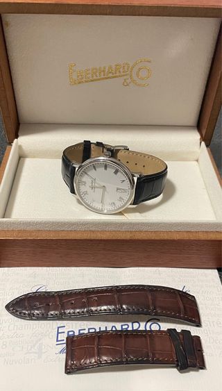 Bellissimo orologio Eberhard & Co. Aliante con movimento automatico. Si presenta in ottime condizioni ed è incluso un cinturino aggiuntivo. - Cassa in acciaio - Quadrante bianco - Cinturino in pelle (nero e marrone)