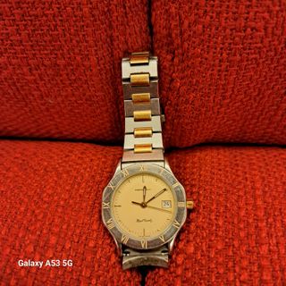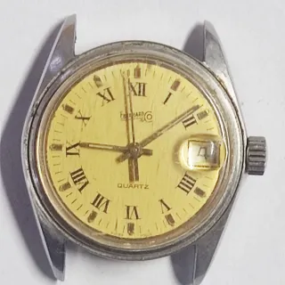 Orologio Eberhard quarzo diametro cassa 3.5mm, per pezzi di ricambio o riparazione, visto e piaciuto come nelle foto. - Quadrante color oro. - Indici a numeri romani. - Datario a ore 3. - Cassa in metallo.
