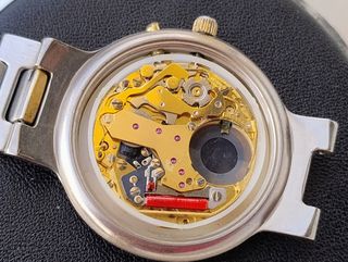 Movimento ETA 255.241 ibrido con le funzione del crono meccanico. Lo cedo all'interno di una cassa VEGLIA 1199 Titan Swiss Watch ma è utilizzato su molti orologi dell'epoca come Eberhard e Merit Cup cronografo PVD Quartz. Il cinturino non chiude da un lato. Il movimento presenta la linguetta del polo negativo parzialmente spezzata, per il resto è in buone condizioni, si regola il giorno e e orario, tutto funziona e i ruotismi sono liberi di girare. Ho testato solo la bobina e funziona. Lo cedo per chi avesse necessità di recuperare ricambi del movimento. La cassa e cinturino sono omaggio.