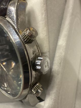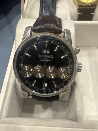 Eberhard & Co. cronografo automatico con cassa in acciaio e quadrante nero. - Cinturino in pelle marrone. - Dettagli in argento sul quadrante. l’orologio e’ in discrete condizioni , le ghiere sono state adattate quindi non sono dell’ orologio . funzionante.