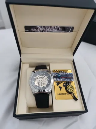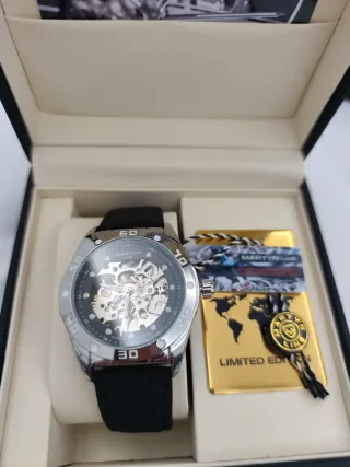 Elegante orologio Martyn Line con design scheletro. - Cinturino in pelle nera. - Cassa argentata. - Meccanismo automatico visibile. Altri modelli nel profilo. Se acquisti più di 1 è possibile fare un prezzo.