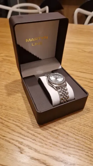 Elegante orologio della marca Martyn Line, con un design metallico e dettagli dorati. Presentato nella sua scatola originale. Scatola di presentazione con finitura marrone. Incisione del marchio in dorato sul coperchio. L'orologio ha un sistema automatico, cioè con il movimento del braccio si carica da solo. Funziona bene e la batteria non si scarica rapidamente, quindi può rimanere giorni senza essere usato e continuerà ad avere batteria.