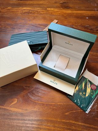 In vendita scatola Rolex completa, in perfette condizioni. Include tutti gli elementi originali. Esterno con il caratteristico colore verde del marchio. Interno con scomparti per orologio e documentazione. Spedizione express📍🚚