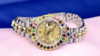 Elegante orologio Rolex Oyster Perpetual Date Just da donna, un pezzo unico che unisce lusso e stile. - Lunetta incastonata con gemme rubini e zaffiro e diamanti . - Quadrante color oro con indici a diamante. - Bracciale in acciaio e oro. - Datario a ore 3.