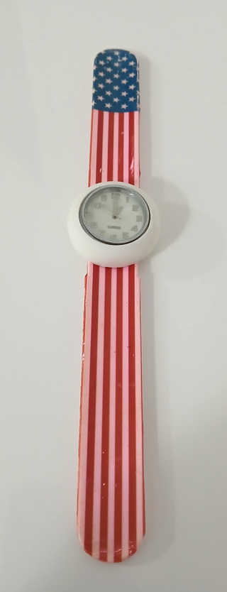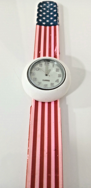 Orologio a scatto con un design ispirato alla bandiera americana. - Cinturino con strisce rosse e bianche. - Parte superiore con stelle e sfondo blu. Orologio a Scatto "Slap Watch" Design Bandiera Americana USA Vintage anni '90 In buone condizioni come da foto e funzionante, batteria da sostituire