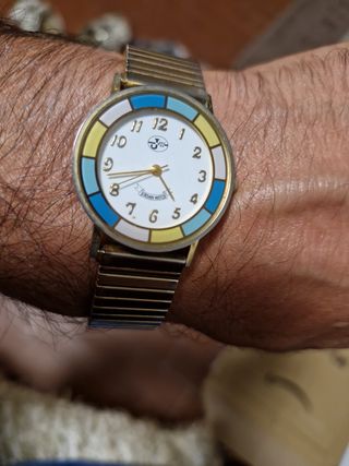 Un orologio Jordan Watch vintage dal design unico e colorato. - Cinturino in metallo estensibile color oro. - Quadrante bianco con indici colorati: azzurro, giallo e grigio. - Logo J W al centro del quadrante.