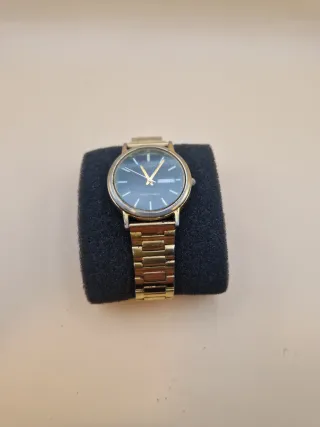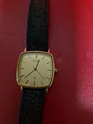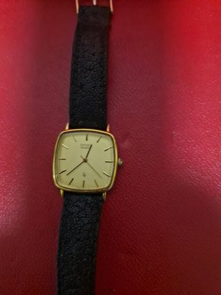 Elegante orologio Citizen dal design classico, con cinturino in pelle nera e cassa dorata. Segni di usra leggermente visibili - Cinturino in pelle nera. - Dettagli in oro sulla cassa.