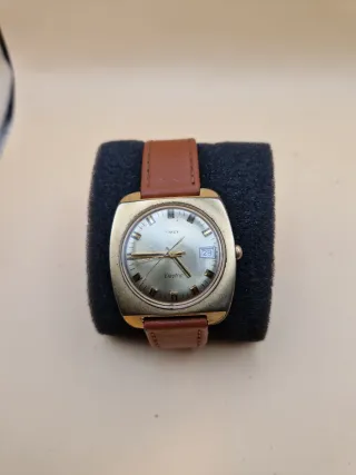 Orologio Timex Electric dal design vintage. Vetro strichiato un grrafio si vede delle foto. - Cassa color oro. - Cinturino in pelle marrone. - Quadrante con datario.