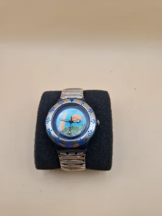Orologio Swatch Scuba vintage con un design unico. - Quadrante con grafica a tema subacqueo. - Lunetta girevole con numeri. - Cinturino in metallo argentato.