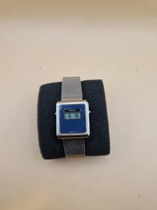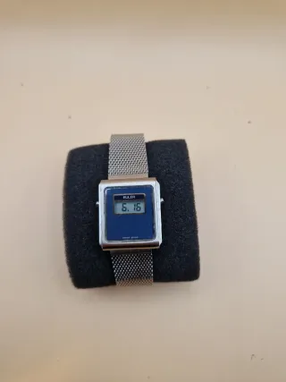 Orologio da polso vintage Buler con display LCD. - Cassa in metallo color argento. - Cinturino in maglia metallica color argento. - Quadrante blu. - Swiss Made inciso sul quadrante.