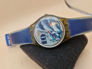 Orologio Swatch Vintage Obelisque GM104 Marca e Modello: Swatch GM104 "Obelisque". Anno di Produzione: 1991. Edizione Speciale: Modello realizzato in collaborazione con il marchio United Colors of Benetton, come indicato dalla scritta sul quadrante. Condizioni: Usato, con normali segni del tempo e ingiallimento della plastica trasparente del cinturino, tipico di questi modelli vintage. L'orologio è funzionante (si consiglia la sostituzione della batteria). Descrizione: Un pezzo iconico degli anni '90, dotato di un quadrante blu scuro con un motivo grafico stilizzato e lancette rosse. Perfetto per collezionisti o appassionati di moda