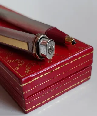 Raffinata penna Cartier Paris, edizione limitata del 1982. Un pezzo da collezione con finiture eleganti.Qualche graffio dall usura. - Design bicolore argento e rosso. - Dettagli in metallo dorato.