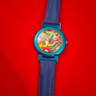 Bellissimo orologio da polso Bulova Benetton vintage, con cinturino in pelle blu e quadrante multicolore con bandiere. La batteria è nuova. - Modello unico e originale. - Perfetto per collezionisti o per un look retrò.