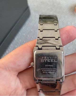 Elegante orologio da polso Fossil dal design vintage. - Cassa rettangolare. - Bracciale in metallo argentato. - Quadrante nero. - non testato