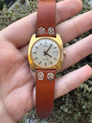 Orologio vintage Kelton con carica manuale. Un pezzo unico per gli amanti degli orologi classici. Perfettamente funzionate - Cassa color oro. - Cinturino in pelle marrone. - Quadrante con indici applicati.