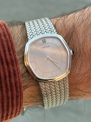 NUOVO CON CARTELLINO 🏷️ Bellissimo Credor (linea di lusso della Seiko) anni 1980 perfettamente funzionante e senza nessun difetto. L'orologio ha una particolarissima lavorazione del quadrante, con corona Cabochon e bracciale integrato con lavorazione intrecciata. Misura cassa: 31 mm
