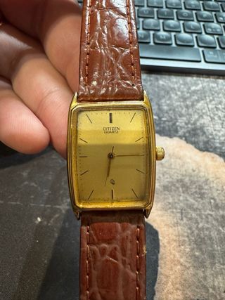 Elegante orologio Citizen con cassa rettangolare e cinturino in pelle. - Cassa color oro. - Cinturino in pelle marrone effetto coccodrillo.