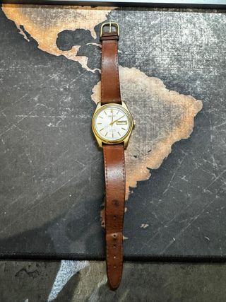 Orologio da polso Seiko con cinturino in pelle marrone e cassa color oro. - Quadrante bianco con indici dorati. - Datario giorno e data. - Movimento automatico. - 25 rubini. - Fondello con incisione JAPAN 5606-7036