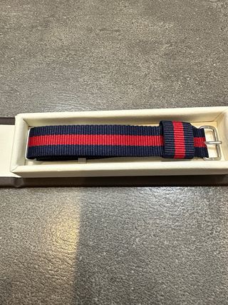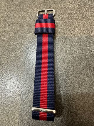 Cinturino per orologio Daniel Wellington con strisce blu e rosse. - Materiale in tessuto resistente. - Fibbia in metallo argentato con logo inciso.