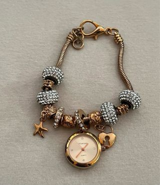 Elegante orologio da polso con bracciale stile Pandora, impreziosito da numerosi charm, von custodia gioiello - Charm a forma di lucchetto e stella marina. - Elementi decorativi con strass scintillanti. - Design unico e personalizzabile.