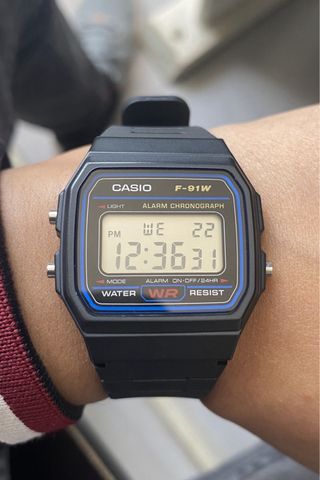 Orologio da polso Casio modello F-91W. - Cassa e cinturino neri. - Display digitale. - Resistente all'acqua.