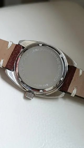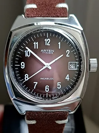 Orologio Arten Jumbo e Vintage anni 60 Movimento FHF 96-4 a carica manuale, ottimo funzionamento e precisione Ultima Revisione Marzo 2020 non necessita di manutenzione Cassa cromata misura 36mm, esclusa la corona di carica Fantastico quadrante anniversario originale non ristampato, numeri arabi bianchi stampati, al centro sfese bianche ore/minuti e secondi ad ore 3 abbiamo la data Vetro plexi in buone condizioni Fondello in acciaio con chiusura a vite. Cinturino nuovo in camoscio modello Vintage L'orologio non ha scatola nè documenti è stato usato pochissimo il suo funzionamento è ottimale è un bellissimo pezzo per la vostra colle