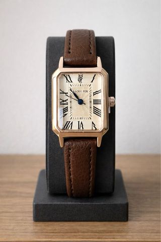 Elegante orologio da polso da donna con un design che ricorda lo stile vintage. La cassa dorata e il cinturino in pelle marrone lo rendono un accessorio raffinato. - Cassa di forma rettangolare. - Quadrante con numeri romani. - Movimento al quarzo (batteria inclusa e funzionante)
