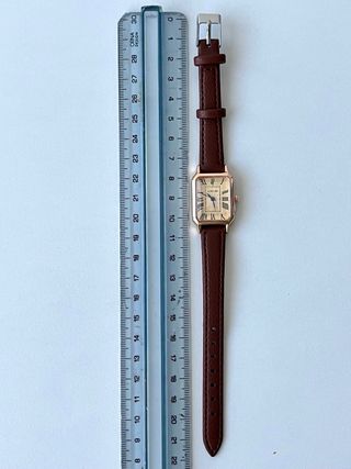 Elegante orologio da polso con cinturino in similpelle. - Cassa rettangolare color oro. - Quadrante color crema con numeri romani. - Cinturino in similpelle marrone testurizzato.