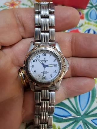 • Marca / Modello: TAG Heuer 1000 Professional - Da donna • Referenza: 980.018N • Movimento: Quarzo svizzero ETA • Diametro cassa: 28,4 mm (esclusa corona) • Spessore: ca. 9 mm • Materiale cassa: Acciaio inox con dettagli placcati oro • Ghiera: Unidirezionale, inserto nero con numeri dorati • Quadrante: Nero, indici tondi e rettangolari luminescenti, lancette dorate (ore tipo Mercedes), datario a ore 3 • Vetro: Minerale piatto • Fondello: A vite, inciso con ref. 980.018N, logo TAG Heuer e impermeabilità 200m • Cinturino: Gomma nera aftermarket (14 mm), fibbia ad ardiglione • Funzioni: Ore, minuti, secondi, datario