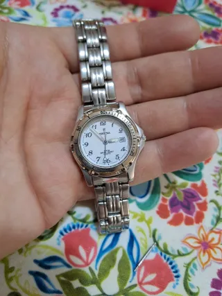 Vendo orologio donna q&q Quartz modello vintage anni 90 , originale funzionante carica batteria , quadrante in acciaio steinless e vetro Quartz sfondo bianco cinturino in acciaio steinless , ottime condizioni ben conservato come da foto , dimensione attacco cinturino chiusura cinturino 22cm spessore cinturino 2.3cm dimensione cassa inferiore a 30mm come da foto - Cinturino in metallo resistente. - Quadrante chiaro con indici. - Datario presente sull'orologio.