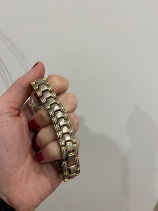 Elegante orologio da polso con cinturino bicolore. - Quadrante bianco con indici. - Cassa in metallo con finitura oro e argento. - Cinturino in maglia metallica.