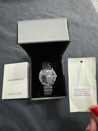 Orologio da polso Emporio Armani con movimento automatico. Presenta un design elegante con quadrante nero e cinturino in maglia metallica. - Certificato di autenticità incluso. - Libretto istruzioni e garanzia. - Scatola originale.