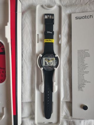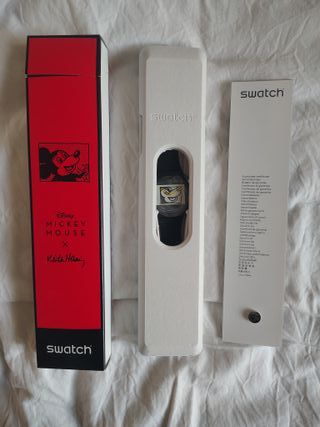 Vendo orologio Swatch originale della collaborazione ufficiale tra Swatch, Mickey Mouse e Keith Haring. Un modello iconico che unisce pop art, street culture e design svizzero, oggi sempre più ricercato dai collezionisti. 🔹 Condizioni: nuovo, mai indossato 🔹 Stato: perfetto, senza segni 🔹 Completo di: scatola originale Swatch a tema supporto interno certificato/garanzia batteria originale mai attivata Il cinturino nero riporta i loghi Disney e Keith Haring, mentre il quadrante presenta una grafica esclusiva dedicata a Mickey Mouse in stile Haring. Un pezzo che funziona sia come orologio che come oggetto da collezione.
