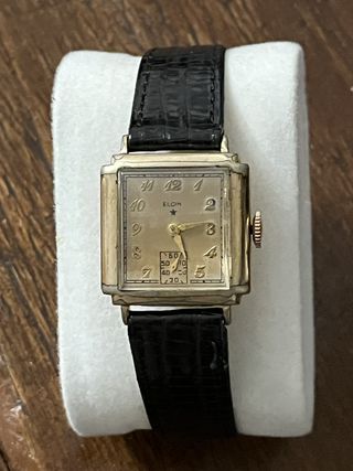 Privato , vendo da mia collezione , Elgin quadrato anno 1936 . Movimento 519 a carica manuale . Cassa placcata oro con segni eta' . Larghezza cassa senza corona 25.5mm . Da ansa a ansa 32mm . Vetro plastica . Orologio funzionante , ritarda circa 2 minuti al giorno . Condizione , a mio parere e per l'eta' , buona . Cinturino nuovo , colore nero , per ansa da 16mm con fibbia placcata oro . Senza scatola e documenti . Non sono state fatte prove di impermeabilita' . Vedere foto originali allegate per valutare condizioni . No consegna a mano .