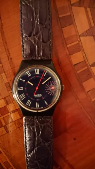 Orologio Swatch con quadrante blu ben funzionante con pila nuova la cassa e il vetro sono come nuove il cinturino in pelle é un po' rovinato dai fori - Quadrante con numeri romani. - Dettaglio a forma di raggiera sul quadrante. - Cinturino effetto coccodrillo.