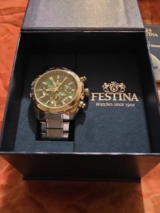 Vendo splendido orologio Festina Chronograph originale, assolutamente nuovo, mai indossato e ancora nella sua confezione originale. L'orologio è un perfetto mix di eleganza e sportività, con un quadrante verde smeraldo molto ricercato e finiture color oro/acciaio.