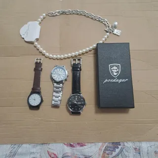 Set composto da tre orologi unisex e una collana. - Orologio con cinturino marrone. - Orologio con cinturino in metallo. - Orologio con cinturino nero. - Collana con perle e ciondolo. N.b. qualche orologio ha bisogno di sostituire la batteria.