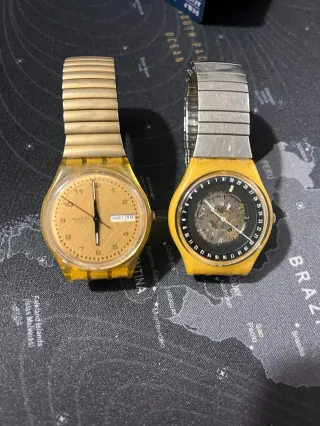 Vendo coppia di orologi vintage Swatch. Sono da revisionare per inuso da molto tempo da collezione. Vendo anche singolarmente. - Uno con quadrante color oro e datario. - L'altro con movimento a vista e ghiera numerata.