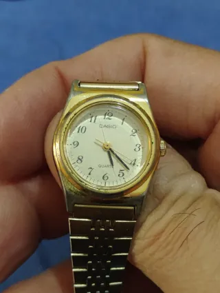 Elegante orologio da polso Casio vintage con movimento al quarzo. Un accessorio classico che aggiunge un tocco di stile. - Cassa e cinturino color oro. - Quadrante bianco con indici neri.