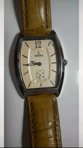 Orologio da polso Festina Several, modello 16024. Un accessorio elegante con cinturino in pelle. - Cassa in metallo color argento. - Quadrante color beige. - Cinturino in pelle con finitura effetto coccodrillo. L'orologio presenta qualche difetto/segno di usura e una spaccatura nell'angolo in alto a destra del vetro. Funziona correttamente, condizioni come da foto.