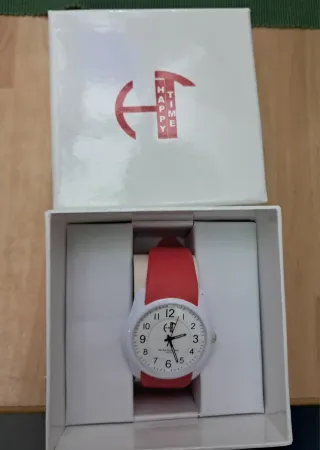 Orologio da polso con cinturino in silicone. - Cassa bianca. - Cinturino rosso. - Quadrante bianco con numeri neri.