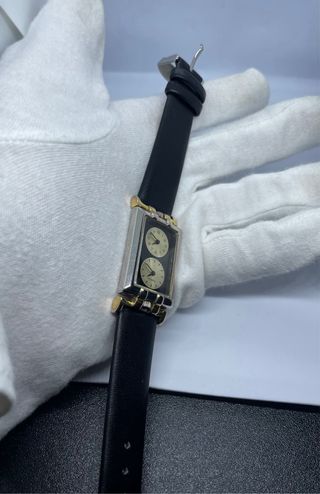 Orologio Fossil vintage con doppio fuso orario. - Cassa rettangolare con finiture oro. - Quadrante nero con due orologi. Orologio funzionante. Cassa tank. Doppia corona. Cinturino appena montato. Due fusi orari. Orologio funzionante. Molto elegante. Anse a maniglia ( in questo caso maniglia fissa ). Dimensioni 24x34mm corone e anse escluse. Orologio davvero elegante. Dress watch.