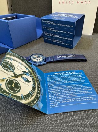 Orologio Swatch x Omega Mission to the Super Blue Moonphase. - Cassa in bioceramica. - Quadrante con dettagli blu. - Collezione MoonSwatch.