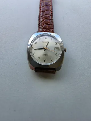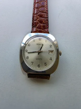Elegante orologio da polso Monvis con cinturino in pelle. Diametro cassa 36mm esclusa la corona - Movimento meccanico a carica manuale. - Indicatore data. - Vetro resistente. - Fondello in acciaio.