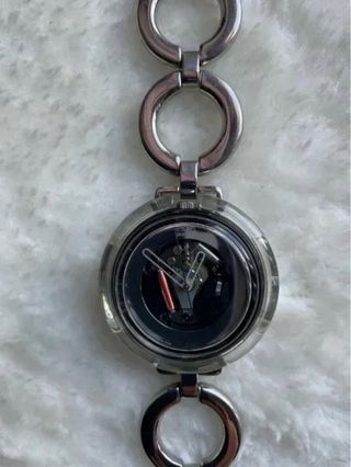Orologio Swatch POP con cassa trasparente, un pezzo vintage anni 90. Cinturino con cerchietti in metallo. Piccoli segni di usura sul quadrante trasparente. Movimento a vista. Perfetto x veri collezionisti. - Design unico con cassa trasparente. - Modello POP. - Stile vintage.