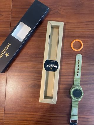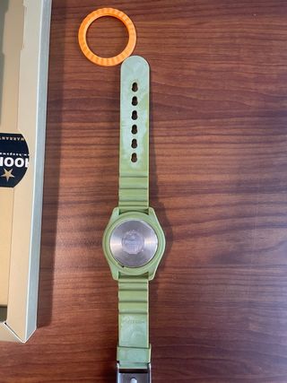 Orologio Hoops mai usato, completo di anello decorativo arancione. - Cinturino in gomma verde. - Anello decorativo in gomma arancione.