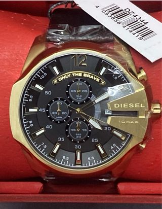 Orologio da polso Diesel Mega Chief con cassa e dettagli color oro e cinturino nero. misura cassa 51mm nuovo mai indossato ancora con pellicole e cartellino e scatola originale Diesel colore rosso con libretto - Cassa in acciaio inossidabile color oro. - Quadrante nero con indici e lancette color oro. - Cinturino in pelle nera. - Resistente all'acqua 10 BAR.