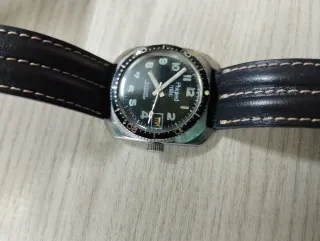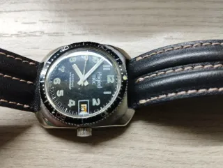 Orologio Phigied Mec con cinturino in pelle nera. - Quadrante nero. - Cassa in metallo argentato. - Cinturino in pelle con cuciture a contrasto. 1 anni 60/70 a carica manuale funzionante senza revisione come in foto usato scontato
