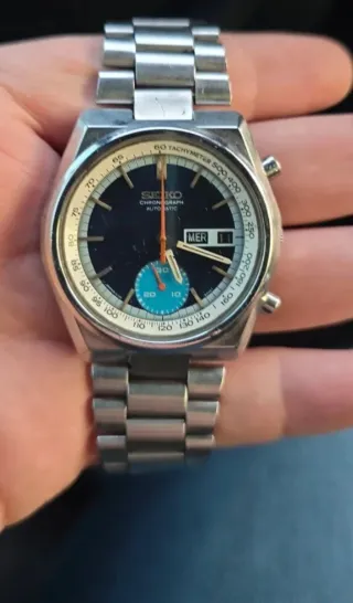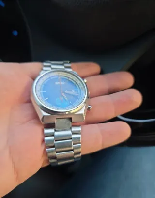 Orologio Seiko Chronograph Automatico da uomo. - Quadrante blu. - Cinturino in acciaio 17,5 cm - Datario giorno della settimana. Orologio marciante, funzione data attiiva ma non sempre funzionante. Si vende come da revisionare. Lievi segni del tempo su tutto l'orologio ma buone condizioni considerando l'età