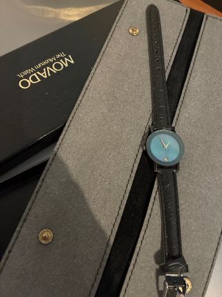 Elegante orologio da donna Movado con quadrante color teal e cinturino nero. - Design iconico Museum Watch. - Cinturino in pelle nera. - Cassa rotonda.